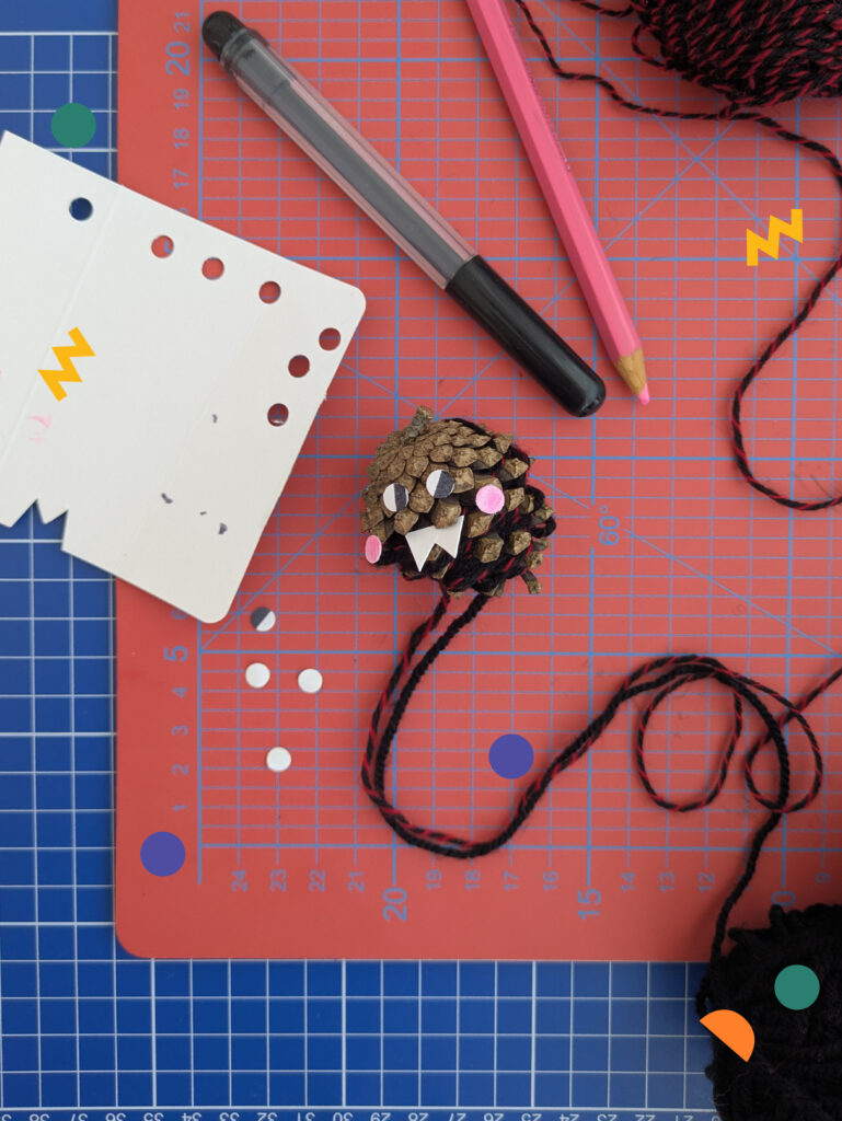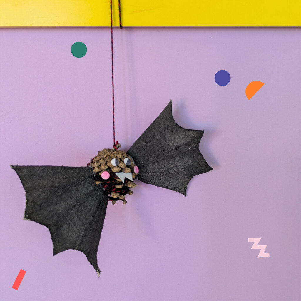 Neben den Flügeln braucht deine Fledermaus natürlich noch einen Körper. Dazu nimmst du einen kleinen Tannenzapfen und umwickelst ihn mit schwarzer Wolle. Jetzt fehlen noch die Augen und ein paar Zähne, welche du aus Papier ausschneiden und aufkleben kannst.
