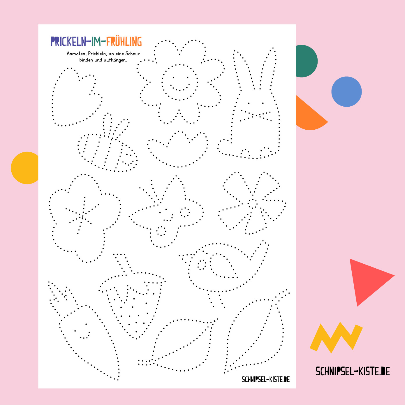 Die Prickelvorlage haben wir ausgedruckt und auf unterschiedlichen Papierschnipseln festgepinnt. Die Kinder haben die Konturen der Frühlingsmotive geprickelt, anschließend haben wir die Umrisse mit etwas Abstand zu den Prickelpunkten ausgeschnitten und auf eine Schnur gefädelt.