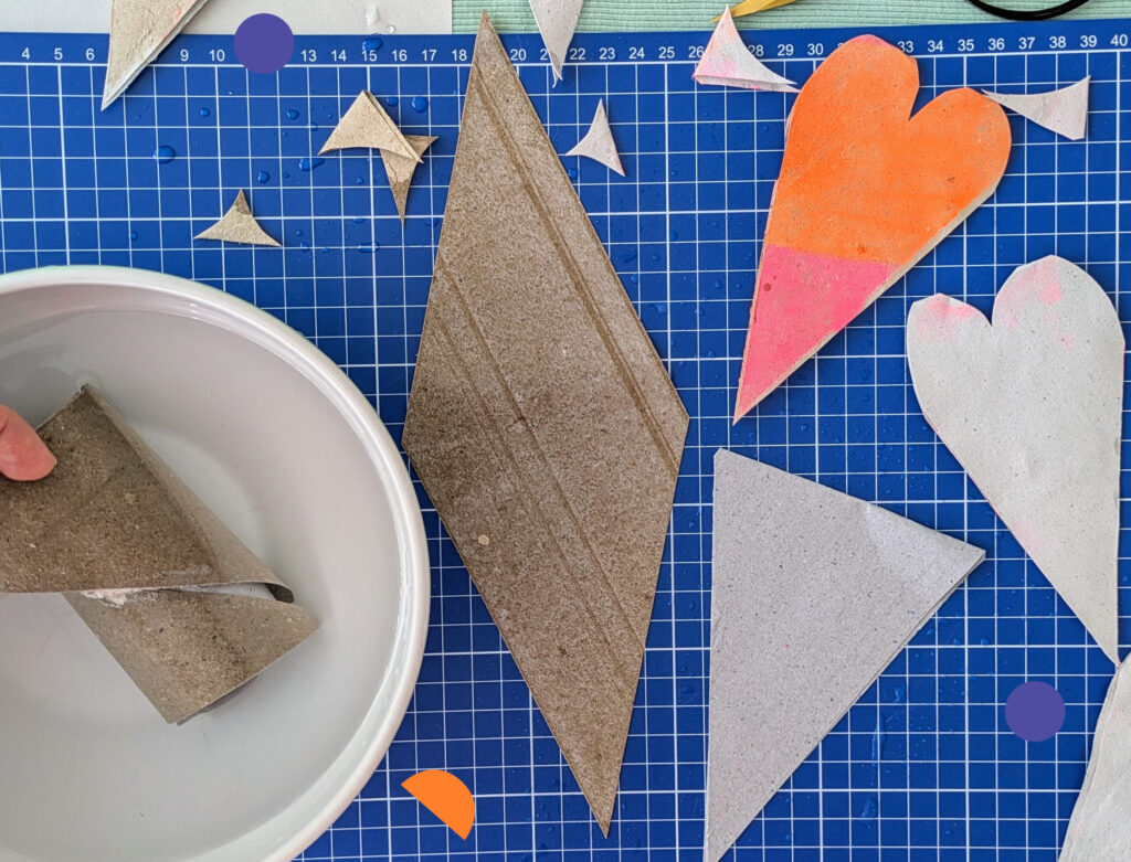 Lege eine leere Klorolle in eine Wasserschüssel und warte bis sie ganz nass ist. Jetzt kannst du vorsichtig die einzelnen Papierlagen auseinander ziehen. So erhältst du zwei Rauten, welche du in der Mitte zu einem Dreieck falten kannst. Das nasse Papierdreieck muss nun trocken.