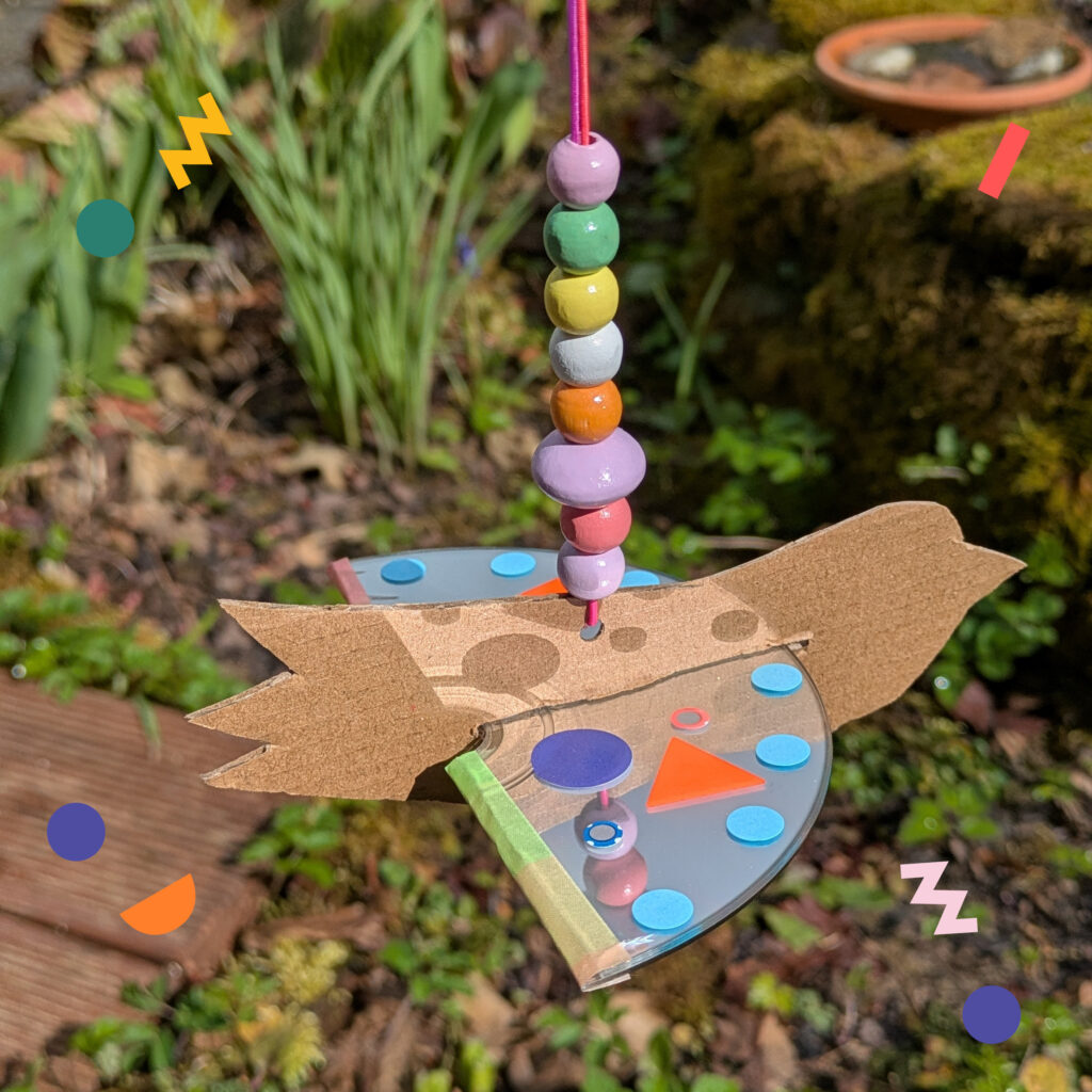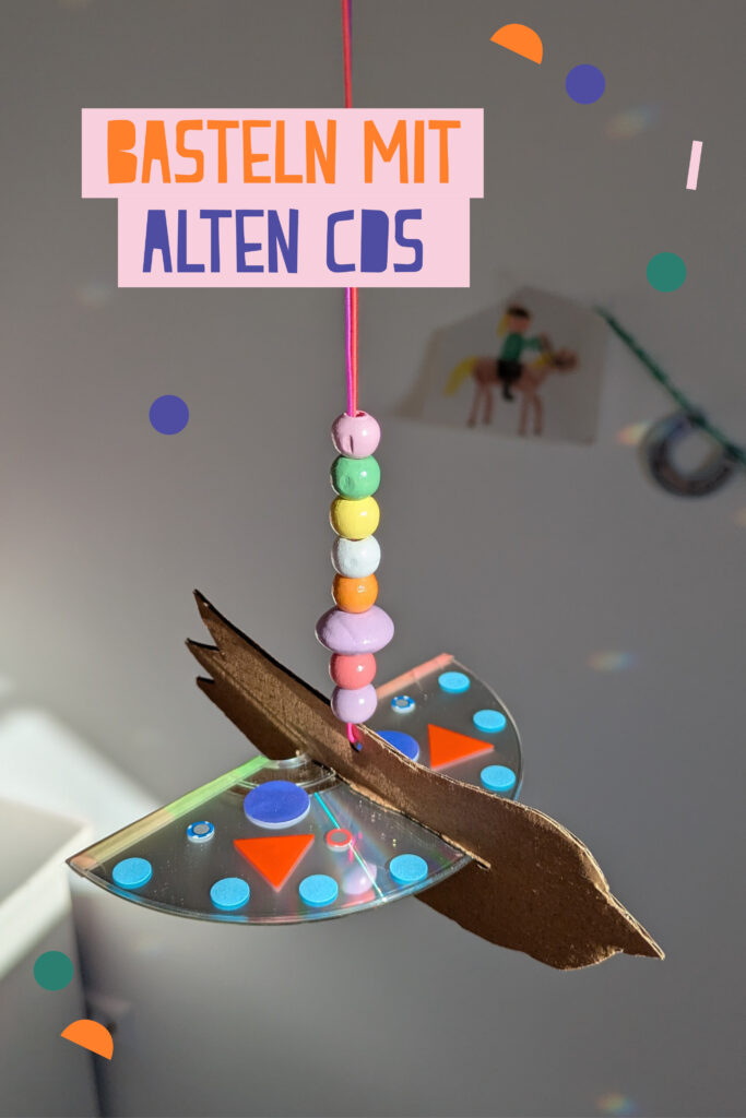 Schiebe die CD-Flügel in den Vogelkörper. Binde den Vogel an eine Schnur. Wenn du möchtest, kannst du die Schnur mit ein paar bunten Perlen verzieren. Und schon ist dein Vogel bereit, die schönsten Sonnenstrahlen einzufangen.